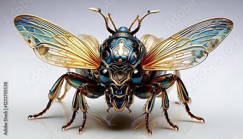 Fototapeta premium A surreal insect-like sculpture with gold and blue accents is shown on a...