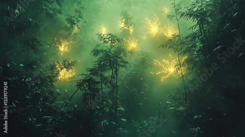 Obraz premium A surreal jungle with glowing plants and mist illuminated by bioluminescent vines