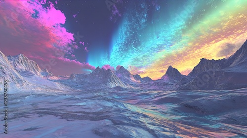 © Jesse, Fototapeta premium A surreal landscape featuring a vibrant, colorful sky filled with shades of pink, blue, and purple, casting a mystical glow over a snow-covered mountain range. The scene is bathed in ethereal light, c