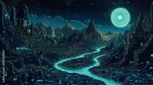 © Oleksandr, Obraz premium A surreal landscape where mountains and rivers are composed of glowing microchip circuits.
