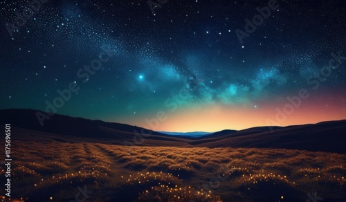 Fototapeta premium A surreal landscape with a field of glowing a crescent moon, and a starry sky