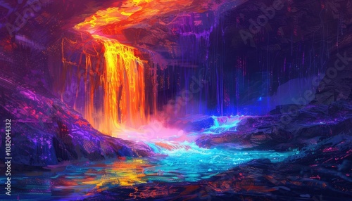 Fototapeta premium A Surreal Landscape with a Lava Waterfall and a Blue Stream
