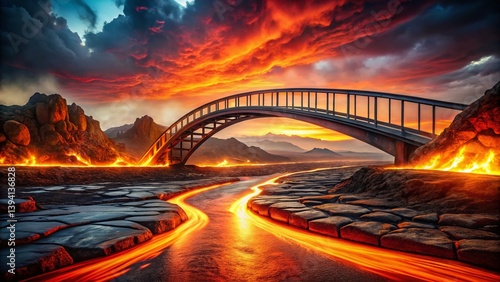 © Sirinporn, Obraz premium A Surreal Lava River Bridge Modern Architecture Meets a Cobblestone Path in a Dreamlike Landscape Explore this stunning