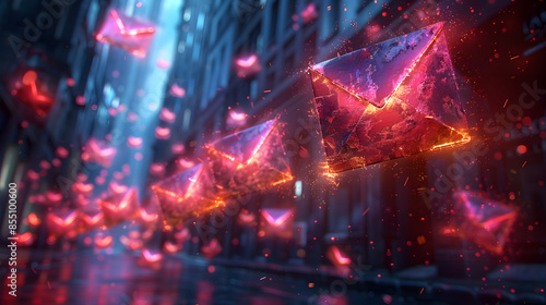 © Antto-AI, Naklejka premium A surreal scene of glowing red envelopes floating through a futuristic cityscape symbolizes digital communication and data transfer.