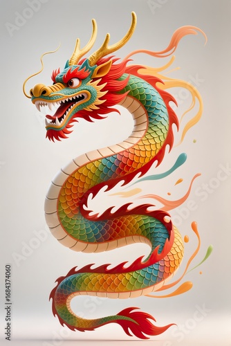 © JetHuynh, Obraz premium A surreal, simple 3d artwork of a Chinese New Year dragon, vibrant scales spilling outside edges with minimal design