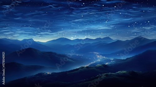 Naklejka premium A surreal starry night, with glowing stars casting soft light over undulating abstract blue hills, swirling patterns of celestial light filling the sky, creating a dreamy and magical nighttime artwork