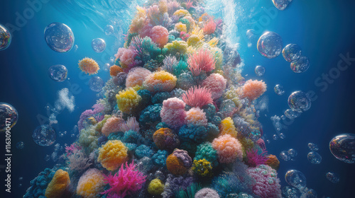 Naklejka premium A surreal tower of organic forms resembling coral and sea life, with vivid...