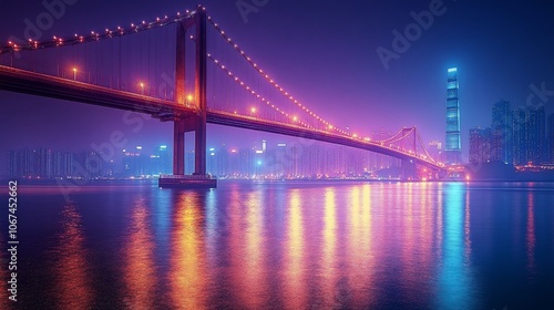Naklejka premium A suspension bridge illuminated by neon lights spans a river, with a...