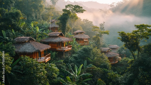 © Manyapha, Fototapeta premium A sustainable eco-lodge nestled in a dense jungle.