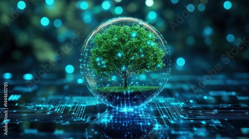 © yoga, Obraz premium A sustainable future. A tree inside a sphere, surrounded by technology
