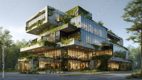 Obraz premium A sustainable office building with large windows, green roofs, and natural light