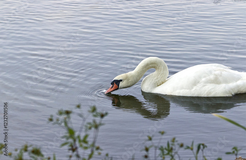 Fototapeta premium A swan floating on a lake. Swan with bowed head and beak underwater. Swan...