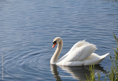 © Pod, Naklejka premium A swan swimming on a calm blue lake with rippling water