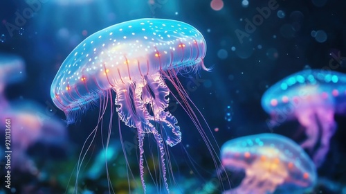 Obraz premium A swarm of glowing jellyfish creating a mesmerizing underwater light show
