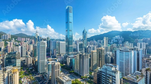 © THUA, Fototapeta premium A sweeping panorama of a bustling capital city, showcasing its towering skyscrapers and modern business district, vibrant streets filled with activity, and a backdrop of a clear blue sky