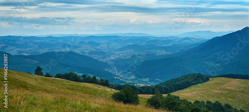 Fototapeta premium A sweeping panoramic view of verdant mountain ridges and valleys under a...