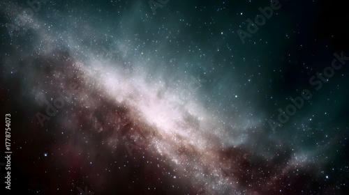 © Bussakon, Obraz premium A sweeping view of a colorful galaxy with dense star fields and glowing cosmic dust clouds in deep space
