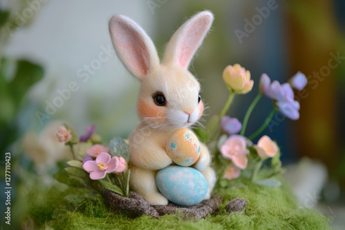 © Volodymyr, Obraz premium A sweet Easter Bunny sitting on a patch of grass, surrounded by pastel-colored flowers, gently holding an Easter egg in its paws.