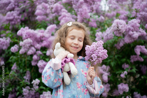 © Natalya Temnaya, Obraz premium A sweet girl of five years against the background of blooming lilacs enjoys spring and has fun. She has loose long wavy brown hair. Pastel colors. Spring. Childhood. Beauty.