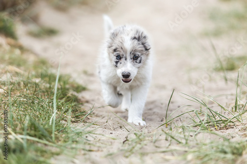 © Bastiaan Schuit, Fototapeta premium A sweet little gray border collie puppy is running towards you over sand with grass growing on both sides.