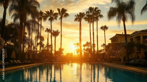 © pinporn manosri, Obraz premium A swimming pool surrounded by tall palm trees, with the sun setting a