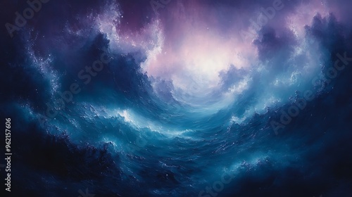 © Helois, Fototapeta premium A swirling, ethereal landscape of blue and purple clouds.