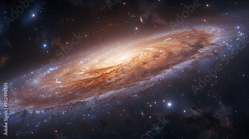 © Helois, Fototapeta premium A swirling spiral galaxy with bright stars and dust lanes in a dark space.