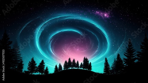 Naklejka premium A swirling vortex of ethereal mist glowing with otherworldly light against a backdrop of a star filled night sky and silhouetted trees.