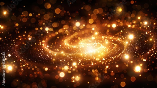 Naklejka premium A swirling vortex of golden glittering sparkles on a dark background suggesting cosmic or festive themes