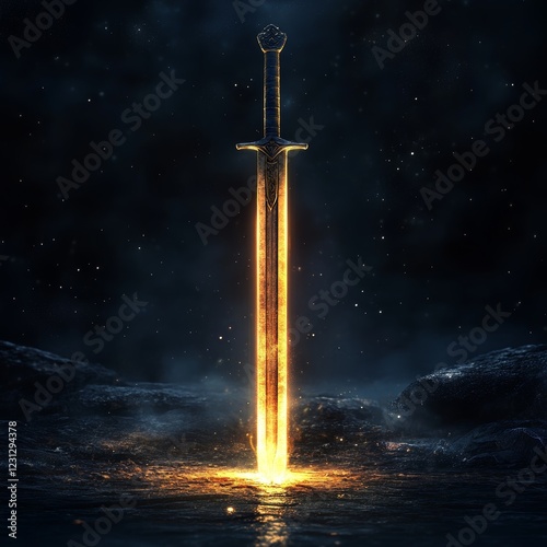 © KerXing, Naklejka premium A sword is lit up in the dark, with a glowing blue light emanating from it. The sword is surrounded by water, and the scene is set in a dark, mysterious atmosphere