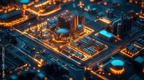 Fototapeta premium A symbolic glowing layout map visualizing optimized logistics zones, workers...