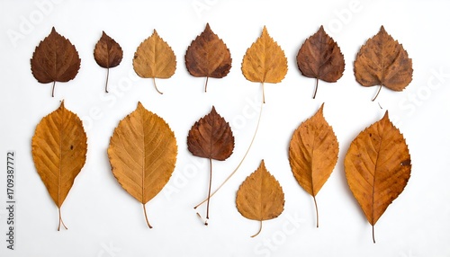 © zerot, Obraz premium A symmetrical arrangement of various autumn leaves in shades of brown and gold, laid out on a plain white background, creates a visually appealing and natural design.