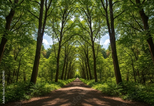 Fototapeta premium A symmetrical path through a lush green forest with tall trees forming an...