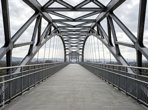 Fototapeta premium A symmetrical steel bridge extends into the horizon under a cloudy sky,...