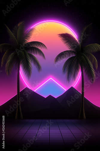 © Natalia, Naklejka premium A synthetic jungle scene where stylized palm silhouettes glow with neon edges, framed by geometric
