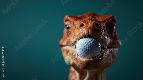 Obraz premium A T-Rex holding a golf ball in its mouth, captured from the front in a...