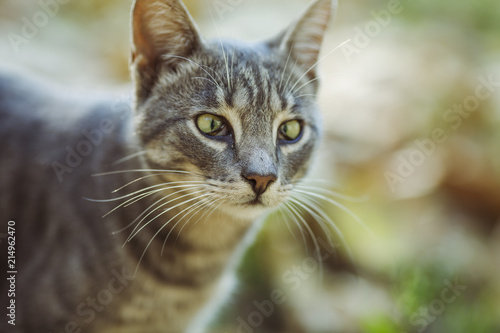 © Виктория Карлова, Fototapeta premium A tabby cat from above on a nature background.