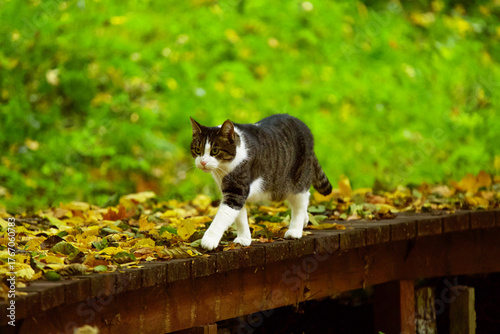 Fototapeta premium A tabby cat walking along a wooden garden path covered with autumn leaves