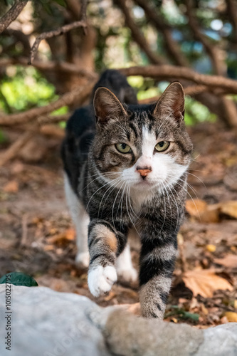 © 子程 龚, Fototapeta premium A tabby cat walking forward among the bushes