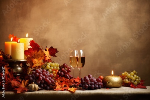 Obraz premium A table is covered with fall decorations including pumpkins, apples, and candles autumn background with copy space