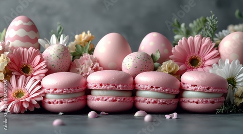© jiawei, Obraz premium A table with a bunch of pink macarons and flowers