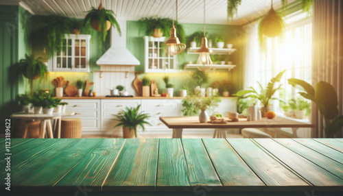 Obraz premium a table with a green table and chairs and a window with a view of the kitchen