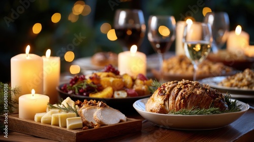 Fototapeta premium A table with a variety of food and drinks, including a roasted turkey