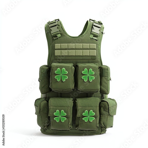 © ธนากร บัวพรหม, Fototapeta premium A tactical vest with green clovers on pockets, designed for outdoor activities. The vest features adjustable straps and a durable construction for various adventures.