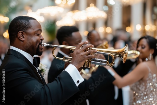 Obraz premium A talented brass musician performs passionately at a luxurious wedding,...