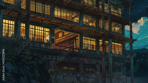 © lia, Naklejka premium A tall building with large windows at night, the interior is dark