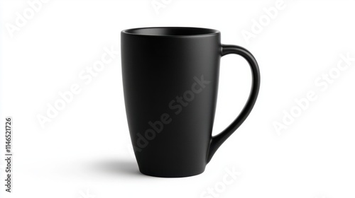 Obraz premium A tall ceramic coffee mug in matte black, featuring a straight handle and a minimalistic aesthetic, on white