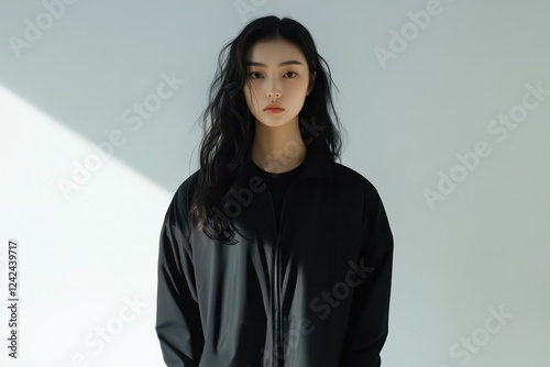 Fototapeta premium A tall Chinese female model, against a white background, in a front view,...