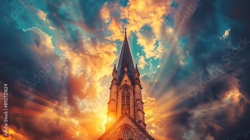 © TranNgoc, Fototapeta premium A tall church steeple with intricate designs, reaching towards a sky filled with dramatic clouds, the details highlighted by golden hour sunlight, a sense of elegance and grandeur,