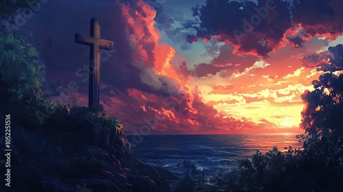 © Pannin, Obraz premium A tall cross at the edge of a cliff, overlooking the ocean at sunset, symbolizing the meeting of faith and nature.